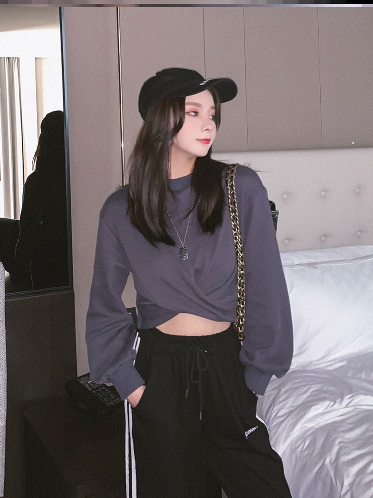 倩倩家服饰202春夏季新款韩版圆领露脐设计感上衣白色运动卫衣女热门设计联盟服务商